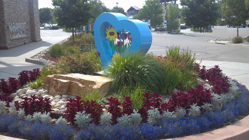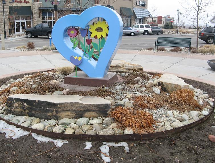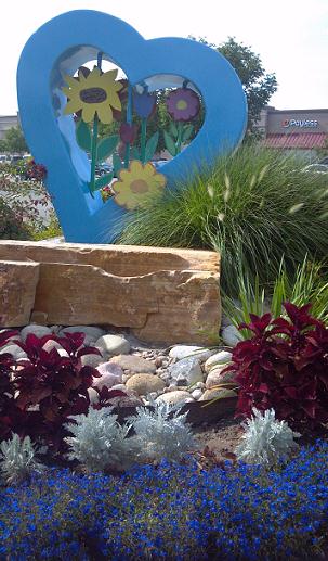 My initial pictures were taken when during the fall.  To more accurately reflect the title of this sculpture, we returned during the Summer and were amazed at the transformation.  A unique aspect to outdoor sculptures is their surroundings can have an impact on how the art is perceived.  During Winter months the "Blooming Heart" sculpute helps anticipate the return of Spring.