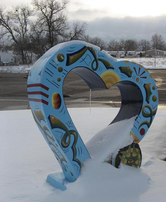 Shown on a cold Colorado morning. Notice the ice cycle hanging down form the center of the heart. With this setting the sculpture take on a somber mood.